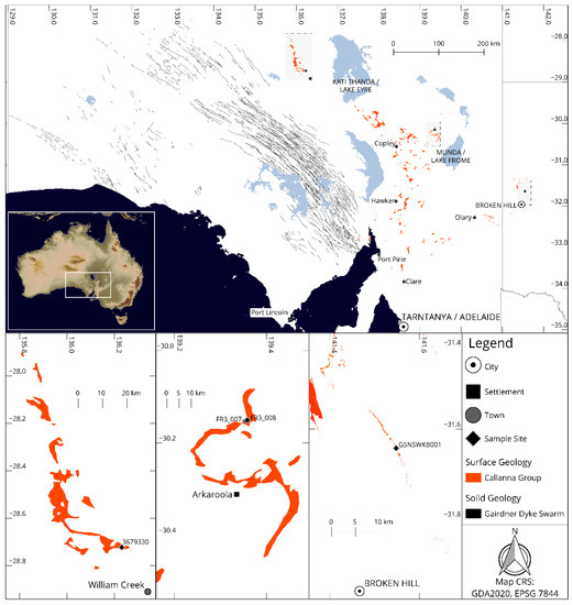 Figure 2. Distribution of the exposed Callanna Group rocks (orange), the subsurface distribution of the Gairdner Dolerite (black lines), and insets showing sample locations (west to east).
