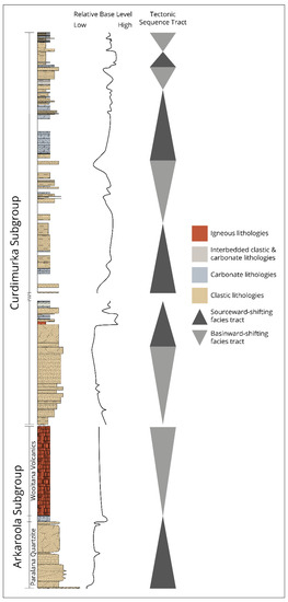 Figure 3. Simplified (composite) stratigraphic log of the Callanna Group based on the type sections from Arkaroola and the Willouran Ranges. This shows the generalised stratigraphy representative of the Callanna Group across the Adelaide Superbasin. Relative base level utilises further information from Mackay [27] and Preiss [24,25]. Tectonic successions follow the terminology of Matenco and Haq [53]. Sourceward-shifting facies tracts are where accommodation space was created faster than the rate of sediment supply (δAS/SS ≥ 1), and basinward-shifting facies tracts are where the rate of sediment supply was faster than the creation of accommodation space (δAS/SS ≤ 1). For detailed lithology patterns and additional stratigraphic unit names, see Supplementary Figure S1.