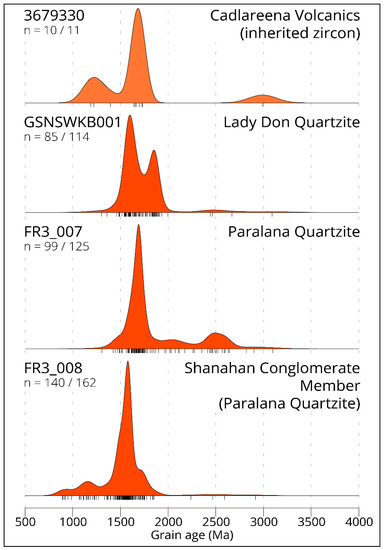 Samples FR3_007 and FR3_008 were both sampled from the Paralana Quartzite. However, FR3_008 was sampled from a stratigraphically lower position, mapped as the Shanahan Conglomerate Member. The MDA of the Paralana Quartzite combines the results of both samples.