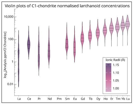 Figure 5. Violin plots of CI chondrite [72]-normalised lanthanoids for all filtered zircon analysed in this study. This plot shows the overall distribution by density estimation of lanthanoid concentrations in all filtered zircons presented in this study. The X-axis is spaced by ionic radii [73] and ordered by atomic number. Black lines across the fill of each plot represent the 0.25, 0.5, and 0.75 quantiles. Bandwidth of the density estimates was calculated using the Botev algorithm from the Provenance package [74].