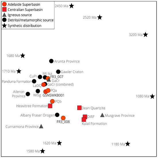 Figure 7. Non-metric multidimensional scaling plot of samples analysed (n > 40) in this study (orange circles) with data from potential correlative formations of the Centralian Superbasin (red squares), potential source regions (black and grey circles and triangles), and synthetic distributions of main population peaks and key zircon growth events in the region. This plot shows relative similarity of all data to each other and is intended as a visual guide. Points that plotted closer together suggest greater similarity. Axes were omitted, as the algorithm produced normalised values with no physical meaning which could be safely removed. Produced using IsoplotR [69]. Abbreviations: CuPr = Curnamona Province; GaCr = Gawler Craton (combined signifies detrital, metamorphic, and igneous data); WiSg = Willyama Supergroup, DiRF = Dixon Range Formation, PQ = Paralana Quartzite. Data were taken from this study and the existing literature (a = does not include Shanahan Conglomerate Member data, b = includes Shanahan Conglomerate Member data).