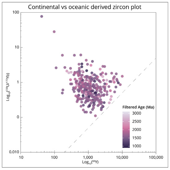 Figure 8. Plot based on [112] used as an indicator of zircon crustal origin. This plots Y against U/Yb, with the dashed reference line dividing the “oceanic” (below line) and “continental” (above line) fields. All data plotted above the reference line, suggesting zircon formation in the crust of continental affinity. Coloured by filtered age, where light is older and darker is younger.