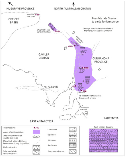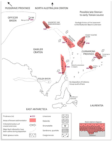 Figure 12. Paleogeographic map showing the known distribution of the Emeroo Subgroup (c. 800–790 Ma) sedimentary deposition, highlighting the southward progression of deposition (and the rift system) in the Adelaide Superbasin. Relative positions of relevant continental blocks in Rodinia are also indicated. Geography of the Adelaide Superbasin is shown in its modern-day configuration, with the modern coastline shown for reference. Adapted from Preiss [41].