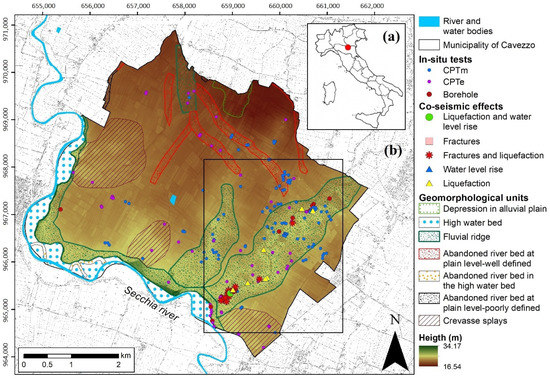(a) Location of the Cavezzo testing site. (b) Geomorphological setting of the study area, digital elevation model with a spatial resolution of 1m, and distribution of the observed co-seismic effects; the available geotechnical investigations are also reported. The black box is the area of the abandoned riverbed, represented in Figure 3.