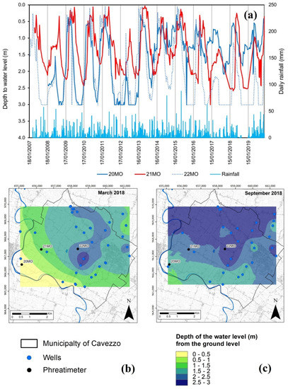 (a) Trend of the depth of the water level measured in the three phreatimeters and private wells monitored by ARPAE. The rainfall measured at Cortile Carpi (about 8 km from Cavezzo) is also shown. Depth of the water level was measured in March (b) and September (c) 2018.