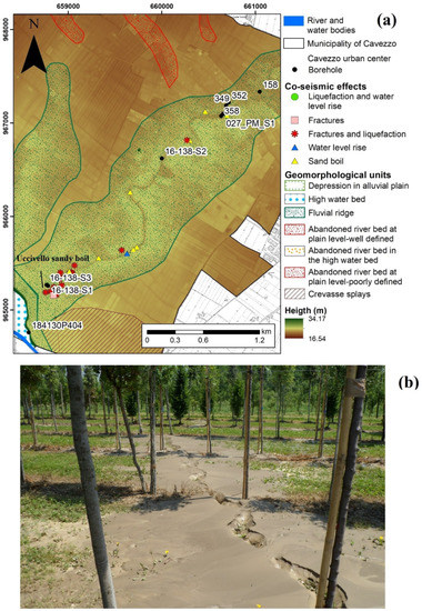 During the 29 May 2012 earthquake [27,28], co-seismic effects, such as liquefaction, water level rise, and fractures, have been observed along the buried abandoned channel of the Secchia River (Figure 1b), are located along this riverbed, which was active during Roman and Medieval times, until the 13th century.