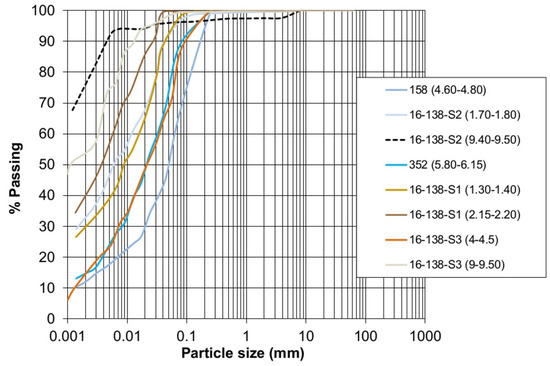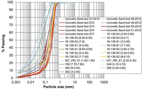 Figure 3 shows the location of the sampled sand boils and boreholes, analysed by the engineering and geotechnical laboratories of the University of Pavia and Modena. Additional information is provided in Table S1, in the Supplementary Materials.