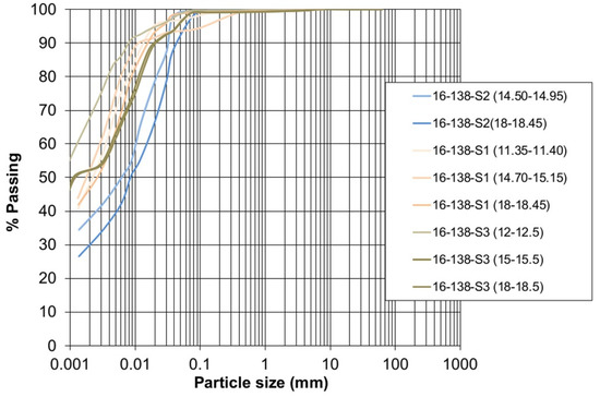 The comparisons between pairs of boreholes and cone penetration tests within a distance of 20 m give insight into the difference in the stratigraphic profiles obtained using boreholes and cone penetration tests. Indeed, as previously reported, the sandy mixtures are not well-identifiable [41,42]. In some cases, the sandy silt and silty sand layer, detected using boreholes, are classified as clayey soils (Figure 9).