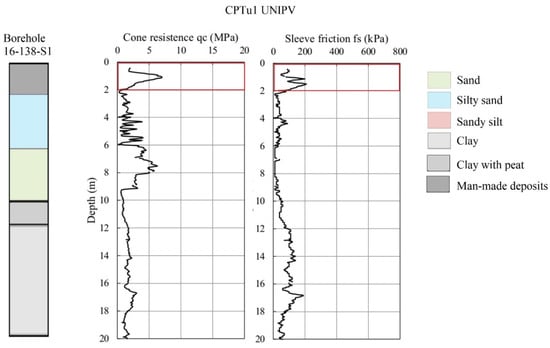 The anthropogenic deposits were distinguished using the boreholes and cone penetration tests. The thickness of these deposits was estimated, considering the depth interval with qc and fs is higher than the other values measured along with the entire profile, representing anomalous measurements. An example is reported in Figure 7.