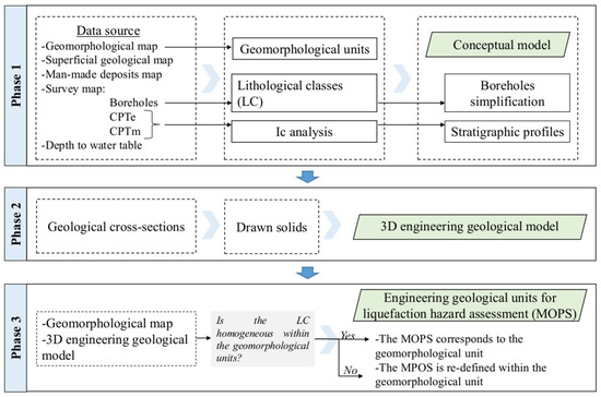 - Phase 3. Engineering geological units for liquefaction hazard assessment (MOPS)The third phase is aimed to delineate the engineering geological units or microzone for seismic liquefaction hazard assessment (MOPS; “Microzone Omogenee in Prospettiva Sismica” sensu stricto [40]). The MOPS are homogeneous areas, showing similar trends in the depth of Ic behavioural parameters and described by a representative stratigraphic profile.