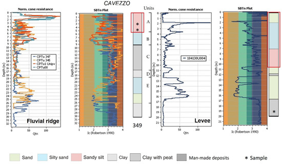 Comparison of normalized cone resistance (Qtn) and Ic versus the representative stratigraphic logs of the borehole for two depositional units, such as fluvial ridge and levee. The red box represents the sandy layers not recognized using the cone penetration tests.