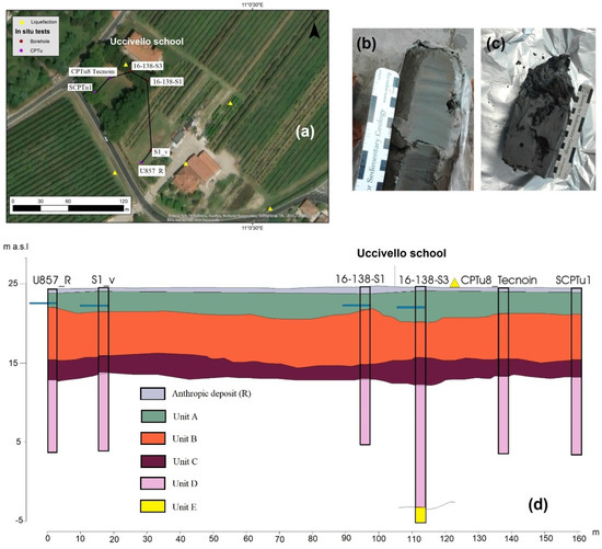 (a) Location of the geological cross-section (black line) near Uccivello school (about 2 km SW of Cavezzo urban center). (b,c) Sample from the borehole 16-138-S3 at depths of 5.50–6.5 and 10.85–11.50 m, showing the shallow sequence of thin levee layers and organic matter-rich clayey soils, respectively. (d) Simplified geological cross-section near Uccivello school. The liquefaction phenomena (yellow triangles) and groundwater level (blue lines) are also reported.