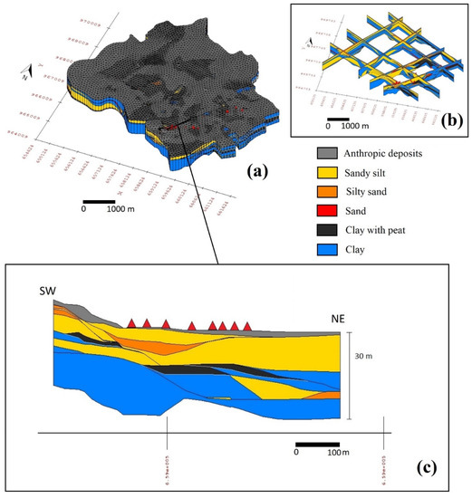 - Phase 2. 3D engineering geological modellingIn the second phase, geological cross-sections are manually drawn by correlating the different lithological units to generate the 3D engineering geological model [39]. The geological cross-sections are drawn longitudinal and transversal to the depositional elements and focus on areas characterized by significant vertical and horizontal variations. The engineering geological model is built up using the “horizons to solids” algorithm via the Groundwater Modelling System (GMS) Aquaveo software. The horizons are numbered consecutively from the bottom to the top. A primary TIN (triangulated irregular network) is created to obtain the 2D mesh of the surface, defining the spatial resolution of the model. The cross-sections are used as a guide, and the horizons allow us to interpolate a surface for each layer.