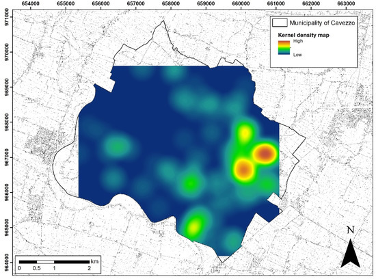 Kernel density map of the geotechnical investigation used to create the 3D engineering geological model of Cavezzo. The extension of the map is limited to the distribution of the available points.