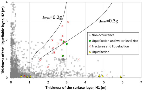 Previous authors observed that the surface manifestations of earthquake-induced liquefaction occur when a base layer of liquefiable soils is overlaid by a confining layer, known as the cap or crust [6,47,48]. In particular, Ishihara (1985) [6] introduced an empirical approach, based on the relationship between the thickness of the liquefiable layer and the thickness of the overlapping non-liquefiable layer, to assess the potential for ground manifestation of liquefaction. The author analysed the liquefaction observed after three large earthquakes occurred in China and Japan, with Mw > 7.5. In this Section, the 3D engineering geological model of Cavezzo was exploited to extract the thickness of the liquefiable and non-liquefiable layer, in order to understand the mechanisms that may have controlled the surface manifestations of liquefaction. The superficial sandy silt, with a very low content of sand, is considered as the potential non-liquefiable layer, and the underneath silty sand is identified as the liquefiable layer. A grid of 20 m was created, and a centroid was carried out for each cell of the study area. For each point, the values of the thickness of the non-liquefiable (H1) and liquefiable (H2) layers were assigned. Layer thickness data were plotted in the graph of Ishihara (1985), also reporting the points of different types of observed co-seismic effects (Figure 14). Most of the observed liquefaction and water level rise, as well as the fractures and liquefaction phenomena, are correctly predicted by the bounds introduced by Ishihara (1985), except for some liquefaction sites. These misclassified points could be due to the presence of laterally drifted conduits of the sand boils in the area with higher thickness of the liquefiable soils (Youd and Garris, 1995). The results are consistent for the area of the Uccivello sand boils localized in the southern zone of the fluvial ridge, aligned along the NE-SW direction. Therefore, the ground surface manifestations observed in the studied area seem to be related to sandy layers of about 1–3 m thick in the upper 10 m from the ground level, laterally and vertically confined.