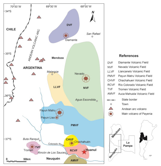 Geological sketch map of the Payenia Volcanic Field showing the Huanul volcano, modified from Bernardi et al. [21].