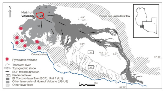 Payenia is located between 460 to 540 km east of the Chile Trench and comprises the largest Neogene-Quaternary volcanic province of South America. The volcanism is manifested as numerous basaltic cinder cones, few andesitic-dacitic composite volcanoes, and lava flows, several of which are extraordinarily long, up to 180 km (e.g., [25,35,36,37]). Its southern part is occupied by a small volcanic field named Río Colorado Volcanic Field [25,28,37,38,39] constituted by pahoehoe lava flows in a northwest–southeast direction. Here, the most important eruptive center is Huanul, a shield volcano (Figure 2) built from basaltic lava flows and pyroclastic aggregates. Its crater is 4 km in diameter and rises ca. 20 m from the surrounding [21]. The basaltic flows overlay the sedimentary rocks of the Neuquén Basin (Jurassic to Paleogene) and the Quaternary sediments of the Colorado river. Eight lava units are currently recognized in the field, and the oldest one, named El Corcovo lava flow, covers a distance of ca. 70 km for an area of ca. 415 km2 [21]. El Corcovo consists of alkaline basalts with a K-Ar age of 0.84 ± 0.05 Ma [40].