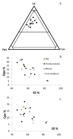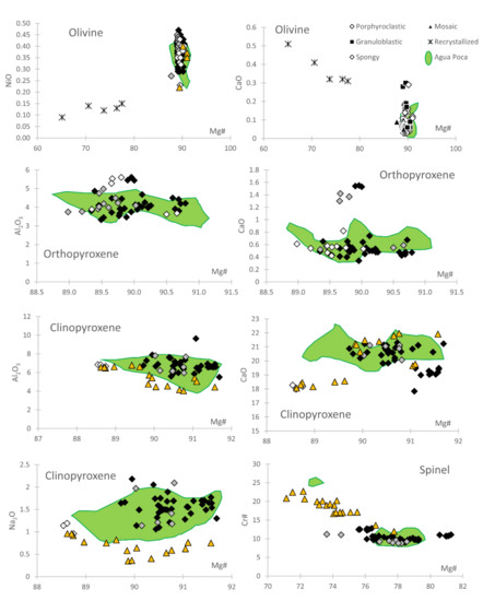 The Mg# content (calculated as Mg# = [Mg2+/(Mg2+ + Fe2+tot)] × 100 mol) of olivine porphyroclasts varies between 88.9 and 90.5. No geochemical differences could be recognized among the different textures (i.e., porphyroclastic, mosaic and granuloblastic; Figure 5).