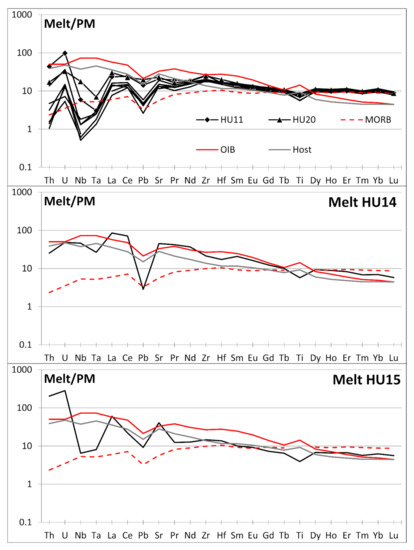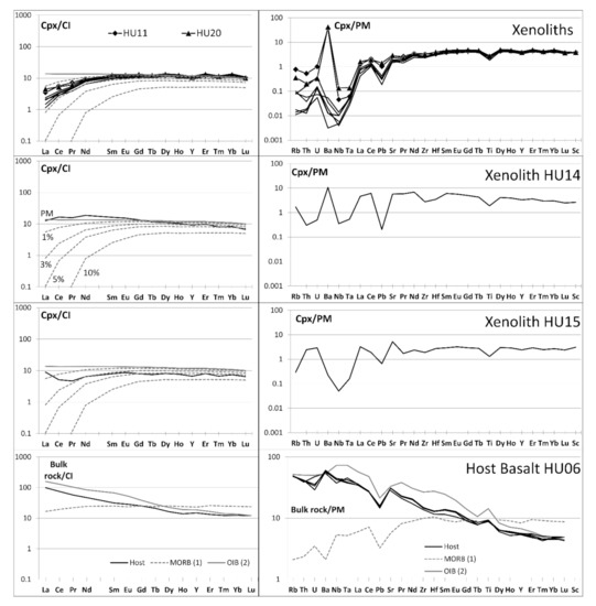 Calculated melts in equilibrium with the LREE-depleted xenoliths have a MORB-like geochemical affinity (Figure 9), different from the host basalt HU06.