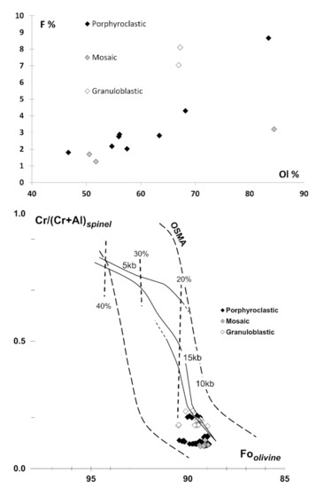 F% estimated with the equation of Warren [63] vs. Olivine modal abundance; OSMA diagram from Arai [64]: Cr/(Cr + Al) in spinel vs Fosterite content in olivine.