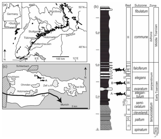 Geographical and geological context. (a) Southwestern Germany, with Posidonienschiefer Formation outcrops indicated in black (modified from [33]). (b) Stratigraphic column of the Posidonienschiefer Formation at the Holzmaden locality (48°38′07.2″ N 9°31′36.4″ E) indicating the stratigraphic provenance of three of the ichthyosaur deadfall communities discussed in the text. A = SMNS 80234, B = SMNS 81841, and C = SMNS 81719. Stratigraphic column from [34], ammonite subzones following [35]. (c) Map of the Holzmaden paleontological heritage protected area showing the provenance and orientation of the same three skeletons as in part (b).