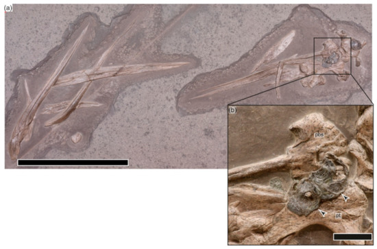 J. Fischer Quarry, Zell unter Aichelberg; εII3: this fragmentary skull consists of an associated braincase and palate, some mandibular elements, and a few teeth (Figure 2). The ventral surface of the parabasisphenoid and articulated right pterygoid is encrusted by two large oysters (Liostrea), one partially overgrowing the other [20]. These are considered to be associated with the development of the reef stage. The unusually large sizes of the two oysters (largest = 52 mm diameter) indicate a prolonged duration of the reef stage before final burial.