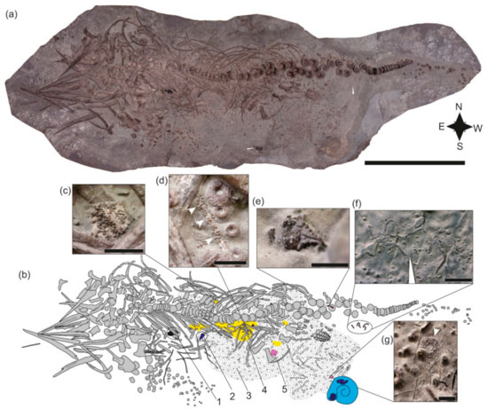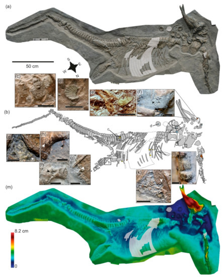 This specimen was not well prepared for taphonomic analysis. Liostrea is observed directly encrusting the skull, some distal ends of ribs from the left side of the body (i.e., the side exposed with the corpse lying on the substrate), and phalanges of the left pectoral fin (Figure 6f,l); additional examples are also associated with the skeleton. The byssate bivalves Propeamussium pumilus (Figure 6d), Plagiostoma sp. (Figure 6g), and Parainoceramya dubia (Figure 6e) are present, but represented by only a single occurrence each, with the exception of the latter taxon. Some of the invertebrates present on the slab include individuals clearly not part of the deadfall community (Figure 6c). There are several ammonites and Parainoceramya valves stratigraphically below the specimen that had colonized the benthos prior to the arrival of the carcass on the seafloor. The specimen was apparently deposited during an interval when bottom waters were sufficiently oxygenated to permit colonization by the bivalves [46], although it has also been proposed that inoceramid bivalves harbored chemosymbionts that would have facilitated colonization of low-oxygen habitats [67]. However, aside from Parainoceramya and the ammonite conchs, there is no evidence for additional background benthos or nekton benthos, respectively, indicating that the associated faunal elements listed above are specifically related to the presence of the carcass.