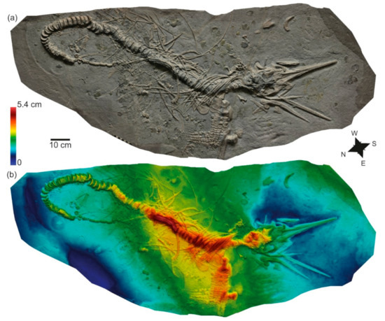SMNS 81841, Stenopterygius quadriscissus, with preparation from below inferred. (a) Orthophoto; (b) false-color depth map showing relative topography of the specimen. Warmer colors (reds) indicate deeper penetration of the bones into the sediment; cooler colors (blues) indicate elements closer to the sediment surface.