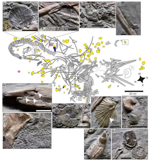 Macroinvertebrates associated with SMNS 81841, Stenopterygius quadriscissus; hatching indicates the extent of the gastric contents. Bivalves are indicated in yellow, aptychi in dark blue, and echinoderms in pink. (a) Propeamussium pumilus; (b) Plagiostoma sp.; (c) indeterminate partial echinoid test; (d) indeterminate serpulid encrusting a dorsal rib; (e) posterior maxilla in dorsal view showing borings, indicated by arrows; (f) Eopecten strionatis; (g) Oxytoma inaequivalvis with articulated right and left valves and encrusted with small Liostrea (arrow); (h) Meleagrinella with ichthyosaurian pedal phalanx; (i) lateral ischiopubis showing accumulation of ophiuroid ossicles in the surrounding sediment; (j) ichthyosaur tooth with distinctive malformation of the crown; (k) fauna encrusting the upper surface of a dissolved ammonite shell: L, Liostrea, S, Serpulidae, C, “Cucullaea” muensteri. Scale bars = 10 mm (a,b,e–i,k), 5 mm (c,d,j).