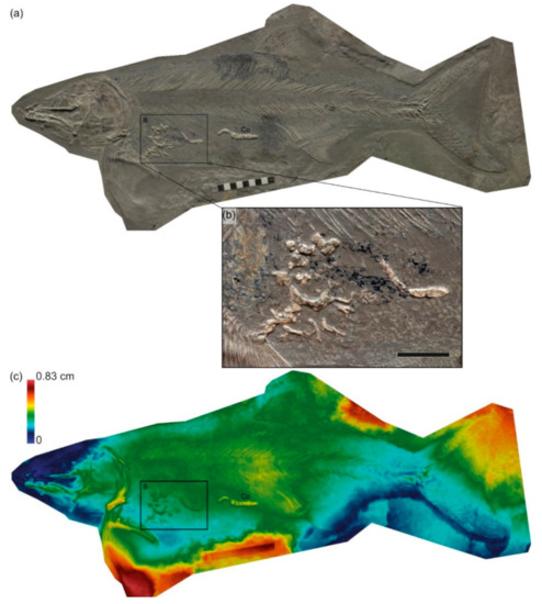 SMNS 51144, Saurostomus esocinus, prepared from below. (a) Orthophoto; (b) inset showing Chondrites burrows; (c) false-color depth map showing the topographical relationship between the carcass and the burrows. Warmer colors (reds) indicate deeper penetration of the bones into the sediment; cooler colors (blues) indicate elements closer to the sediment surface. Co = cololite. Scale bar in cm (a), 20 mm (b).