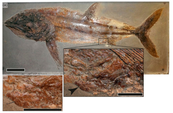 GPIT-PV-31586, Pachycormus macropterus. (a) Overview photo; (b) inset showing the crustacean remains anterior to the anal fin, indicated by arrow. (c) Close-up of (b). Abbreviations: c, crustacean; co, cololite; pel? pelvic plate; pg, anal pterygiophores. Scale bars = 10 cm (a); 20 mm (b,c).