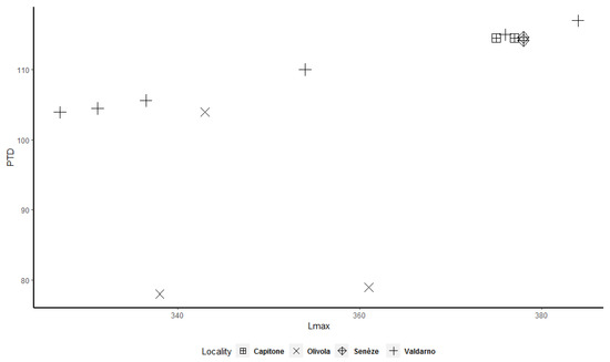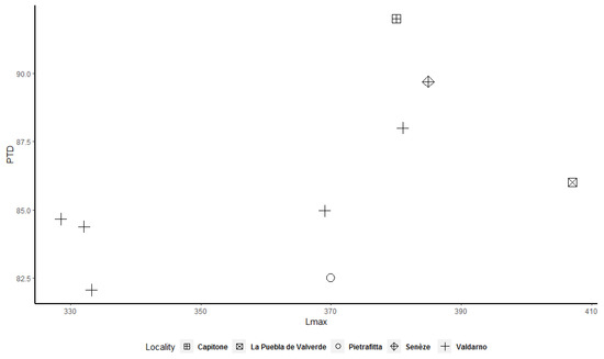 Scatterplot between the maximum length (Lmax) and the proximal transverse diameter (PTD) of the tibia.