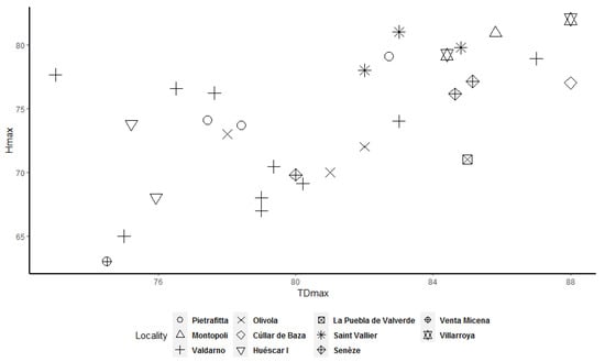 Scatterplot between the maximum height (Hmax) and the transverse diameter of the sustentaculum talii (TDst) of the calcaneum.