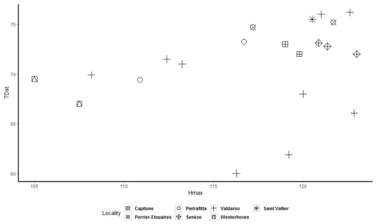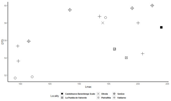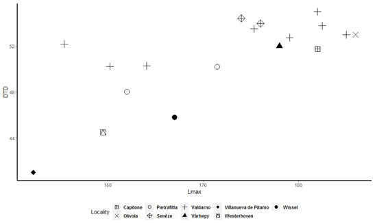 More importantly, we observed that some adult specimens collected from the same locality, and therefore geographically and temporally close to each other, are plotted in two different clusters and are, in many cases, widely separated (Figure 7, Figure 8, Figure 9, Figure 10, Figure 11 and Figure 12). As a result, individuals from Valdarno (the most frequently represented locality in the dataset and the type area of the species), Pietrafitta, Olivola, and Senèze suggest that morphometrical variation attributable to sexual dimorphism is not overshadowed by the variability related to the geographical and temporal distribution of the species. However, the analysis of the Valdarno sample only (Supplementary Materials S2) did not strongly support the bimodality patterns observed through bivariate plots (Tables S1–S6) due to the too small number of observations. Only a few measurements (e.g., DTD of MTIII) are indeed statistically significant.