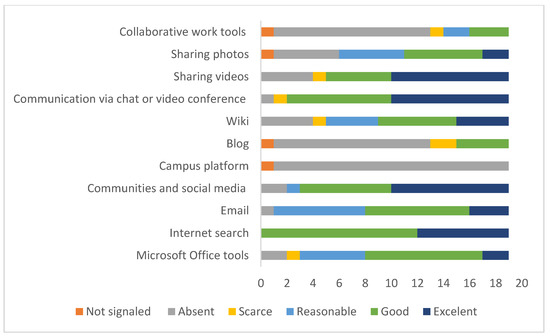 In the case of the 7th grade (Figure 3), half of the students (9) reported excellent knowledge of video sharing tools, chat or videoconferencing and participation in communities or social networks. In this question, it is worth noting that a considerable number of students reported not knowing collaborative work tools (12 students), blogs (12) and Campus platform (18). Most of these students have an Instagram account (14 students).