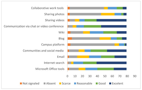 5th grade students (Figure 4) reported excellent or good knowledge of video sharing tools (56 students), Internet search (58), chat or videoconferencing tools (57) and participation in communities or social networks (48). However, many students reported not knowing collaborative work tools (46 students), photo sharing (42), blogs (37) and Campus platform (59). The majority of these students do not have an account on social media. For instance, only 20 of them have an Instagram account.