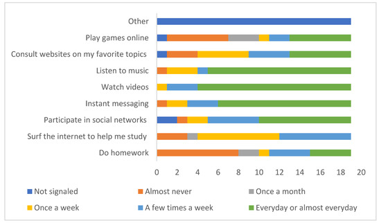 Finally, 5th grade students (Figure 6) prefer watching videos (42 students), listening to music (32, doing homework (30) and using instant messaging (26). However, these students use digital devices less frequently than the older ones.