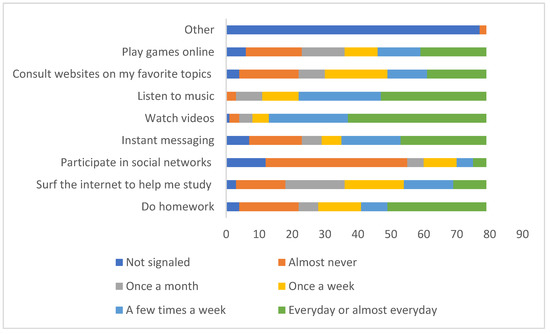 When asked about activities performed on devices connected to the Internet, students prefer watching videos, listening to music and using instant messaging applications.