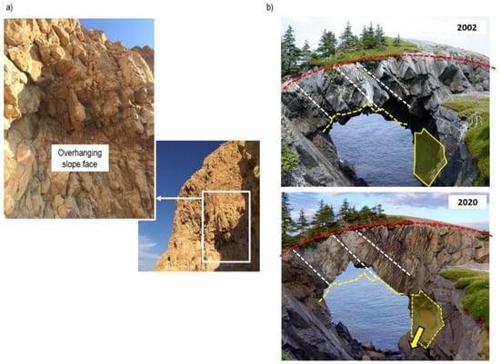 Examples of natural structures whose stability is controlled by the presence of rock bridges: (a) Masada fortress, Israel; and (b) Berry Head Arch, Canada, in 2002 and more recently in 2020.