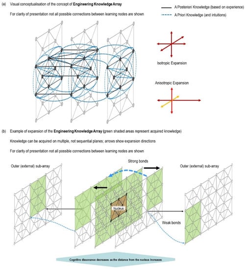 In our proposed model, the nucleus of the expanding engineering knowledge array is surrounded by outer layers of bonded external sub-arrays (Figure 5b), and knowledge transfer may occur in an analogous way to chemical bonds, whereby weak or strong bonds may develop upon which the engineering knowledge array grows and mutates its shape. The links may represent either empirical knowledge or intuitions. Systemic knowledge (and bias) belongs to the nucleus, while the sub-arrays are the domain of superficial knowledge. For example, knowledge acquired while studying for an engineering degree would reside close to the nucleus, while changes in our interests in different engineering and science disciplines, and the degree to which our mind is subject to external influences and biases, would manifest in the creation of sub-arrays.