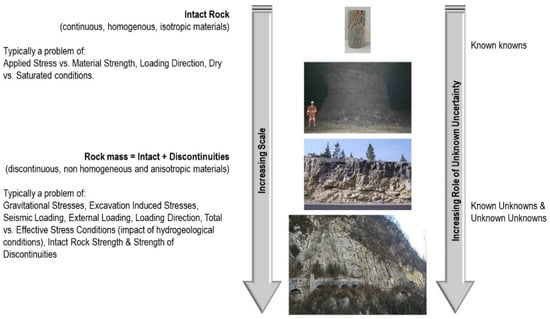 - Unknown unknowns are conditions that cannot be expected, because there has been no prior experience or theoretical basis for the conditions to occur []. In this context, unknown unknowns exist in the dimension of a priori knowledge. Intuitions may guide us towards the critical information required for the successful design of an engineered structure, thus allowing us to narrow the impact of uncertainty; the latter can be considered a material manifestation of unknown unknowns. However, unknown unknowns are also the realm of unknown uncertainty, a complex form of uncertainty that engineers, despite their practical experience, cannot remove from the design process. To make matters worse, the inherent variable nature of rock material is such that in rock engineering, the role of unknown uncertainty increases as the scale of the engineering problem increases [].