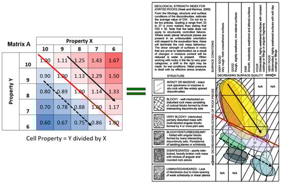 The irreversibility problem is a clear example of the danger that we incur when we sterilise (i.e., remove) qualitative geological knowledge to transform it into quantitative engineering information. By superimposing rock types from actual field studies (data from [,]), a geological trend becomes apparent (Figure 8), which agrees with the trend of Matrix A, for which the same emerging value cannot be obtained using different combinations of [Yi, Xj].