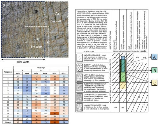To demonstrate the inherent subjectivity behind the assessment of rock mass quality, and the artificial variability that may result, we asked 16 persons with different levels of experience (ranging from recent graduates to professional engineers with 5+ years of experience) to estimate the GSI of a rock mass based on the study of a series of photos. We recognise that the observation of photographic evidence is not as convincing as direct field observations, but there are many instances in which engineers may be asked to rely on photographic evidence, or to analyse digitally acquired information (e.g., photogrammetry and laser scanning data). Figure 9 shows the three outcrops used in the survey. Unknown to the persons taking the survey, the three images represent the same outcrop, with two images showing a 5 m wide rock exposure, and the larger image showing a 10 m wide exposure. Furthermore, the two smaller exposures are part of the larger one, and the original images are rotated and slightly decoloured to give the impression of three different rock outcrops. The survey assumed that the jointing conditions did not change across the outcrop and the respondents were instructed to assume good jointing conditions for all three cases (A, B, and C).