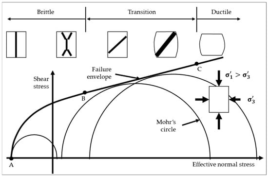 The possible modes of failure or fractures based on the mechanical behavior of the caprock are illustrated in the Mohr–Coulomb failure envelope (modified after Nygård et al. []). The points A, B, and C on top of the failure envelope define the brittle, transition, and ductile zones of any caprock.