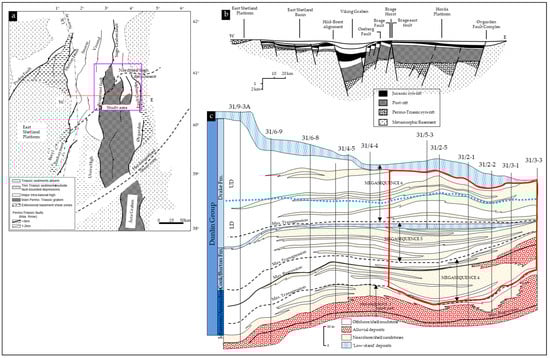 (a) Main structural elements of the northern North Sea, resulting from Permo–Triassic extension, reveal the major faults and Nordfjord–Sogn detachment (modified after Færseth, []). Violet rectangle within the figure a represents the study area covered in this research (b) An E–W cross-section through the northern North Sea (marked in (a)) shows the sedimentation and major faults during syn- and post-rift times (modified after Færseth, []). (c) Schematic representation of Triassic and Jurassic post-rift mega-sequences (modified after Steel, []). The Horda Platform area is marked in the red rectangle.