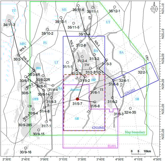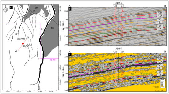Map shows the faults and hydrocarbon fields in the Aurora injection site (a). The first CCS license (EL001) and possible injection well (31/5-7) are also presented. A SW–NE (AB) cross-section of full-stacked seismic (b) and inverted volume of shale (c) near the 31/5-7 well is illustrated for reference. Top horizons (UD—upper Drake; LD—lower Drake; C—Cook; UJ—upper Johansen LJ—lower Johansen and S—Statfjord) and logs (GR—gamma-ray and Vp—P-wave velocity) from well 31/5-7 are also shown. Note that the property maps (Figure 15 and Figure 16) were extracted on top of the UD and LD horizons.