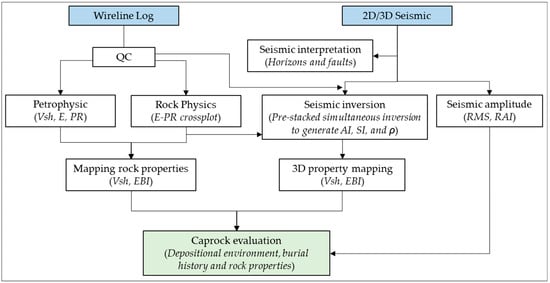 There were considerable thickness variations observed within the studied wells in both upper and lower Drake units (Table 1). All the studied wells (50) were used for structural, thickness, temperature gradient, and exhumation studies, while 30 wells with available logs (i.e., gamma-ray, density, P-sonic, resistivity, neutron porosity, and vs. predicted by machine learning) were considered to evaluate the caprock geomechanical properties (i.e., Young’s modulus, Poisson’s ratio, and brittleness). A seismic (2D and 3D) interpreted top Drake time structure map was used for structural trends during the map generation process. Moreover, caprock characterization using post-stacked seismic attributes and pre-stacked seismic inverted properties was carried out based on the cropped seismic 3D cubes (the cropped area illustrated in Figure 4). NPD well tops of the studied wells were also updated based on Steel’s [] stratigraphic sequence concept (Figure 2c). In this study, an integrated approach based on wireline logs and seismic data was employed to evaluate caprock properties. The research workflow is presented in Figure 5, where different methods used in this study are illustrated step by step. The techniques used to investigate the depositional history and diagenetic processes, map caprock properties, and estimate brittleness indices are briefly described below.