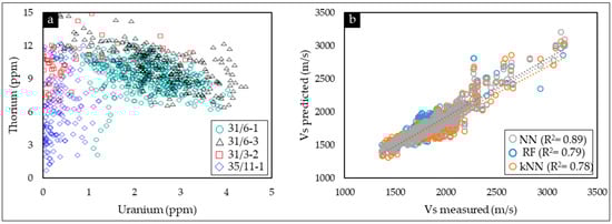 (a) Uranium versus thorium cross-plots of the lower Drake unit clearly show the variation of spectral gamma-ray values within the four studied wells. (b) A comparison between machine learning algorithms estimated vs. with the measured Vs. The Drake Formation data points from well 31/1-1 were used to construct the crossplot.