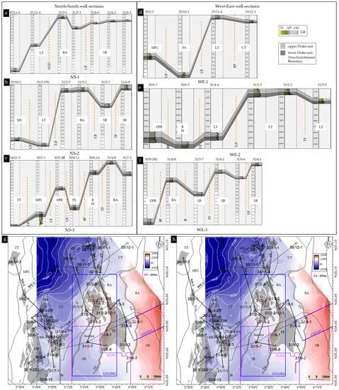 Six well correlations were generated flattened on 0 m TVDSS to evaluate the present-day structural variations within the study area (Figure 7). The correlation profiles are also shown on top of the structural maps (Figure 7g,h). Three of these profiles represent north–south sections located in the east (NS-1), middle (NS-2), and west (NS-3) of the study area. The remaining three profiles are roughly oriented east–west and cover the north (WE-1), middle (WE-2), and south (WE-3) sections. The possible structural boundaries between the wells are also demarcated based on the NPD’s [] structural elements dataset. The southern wells of the NS-1 panel located in the Stord Basin (SB) and Bjørgvin Arch (BA) show comparatively shallow present-day burial depths. However, the wells located to the north show significantly deeper burial beyond the Nordfjord–Sogn detachment (NSD) into the Lomre terrace (LT) (Figure 7a). A similar trend is also observed in the middle (Figure 7b) and western sections (Figure 7c), where the overall deepening towards the north with several structural boundaries (i.e., major faults) is present. On the contrary, the west–east sections show increasing burial depths from east to west (Figure 7d–f). The major faults such as the Kinna fault (KF) in the north, Troll fault (TrF) in the middle, and Brage fault (BF) in the south demarcate the platform and basin areas. The influence of these major faults was observed in the east–west sections. Moreover, within the individual fault blocks in the platform area, the local depth variations are also observed at the major faults’ (i.e., Vette, Tusse, and Idunn faults) bounding blocks, which are mainly located in the Stord Basin (SB), Bjørgvin Arch (BA), and Oseberg Fault Block (OFB) (Figure 7f).