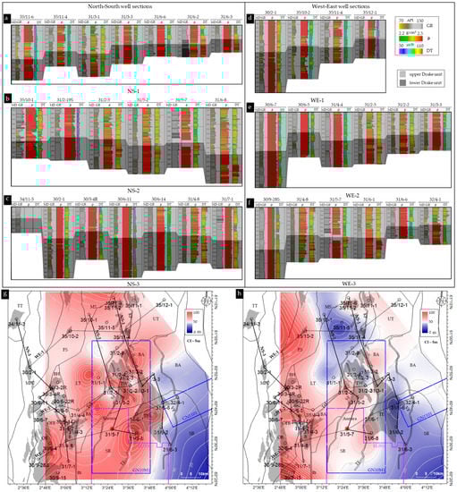 Well sections flattened on top of the upper Drake unit representing thickness and property variations in wells covering the north–south (a–c) and the east–west directions (d–f) in the study area. The thickness maps of the upper Drake (g) and lower Drake (h) units exhibit the correlation profiles’ locations and show the study area’s overall variation. Color legend used to displayed wireline logs is also shown.